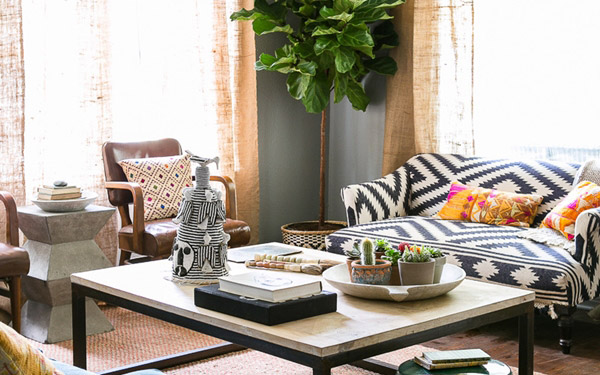 หากวัสดุที่นำมาตกแต่งห้องเป็นวัสดุที่มาจากธรรมชาติซะส่วนใหญ่ อาจจะทำให้ห้องดูเรียบและไม่น่าสนใจ ให้ลองหาโซฟาบุนวมลวดลายคิลิมมาวางไว้สักตัว จะเน้นที่โซฟาที่มีสีสันหรือโซฟาลายสีขาว-ดำก็ได้ จะทำให้ห้องดูน่านั่งขึ้นเยอะเลยล่ะ