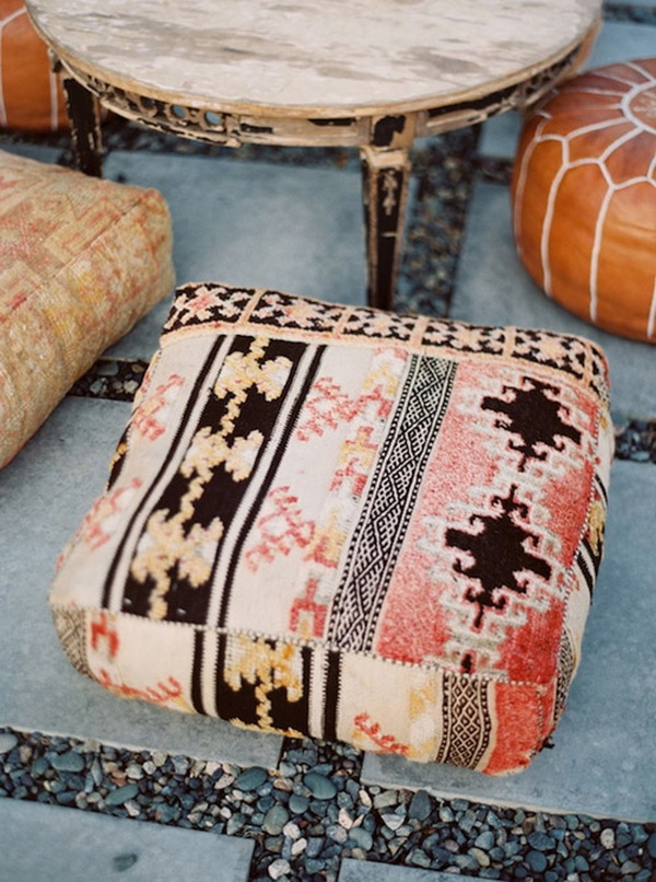 เบาะรองนั่งนุ่มๆ ลายคิลิม นอกจากจะช่วยเติมแต่งสีสันให้ความรู้สึกสดชื่นแล้ว ถ้าหากนำมาตกแต่งตามมุมต่างๆ ในบ้าน ก็จะช่วยเพิ่มบรรยากาศของการต้อนรับอย่างอบอุ่น เหมาะกับการนำตกแต่งสถานที่ในงานปาร์ตี้หรือมุมนั่งเล่นเอาท์ดอร์