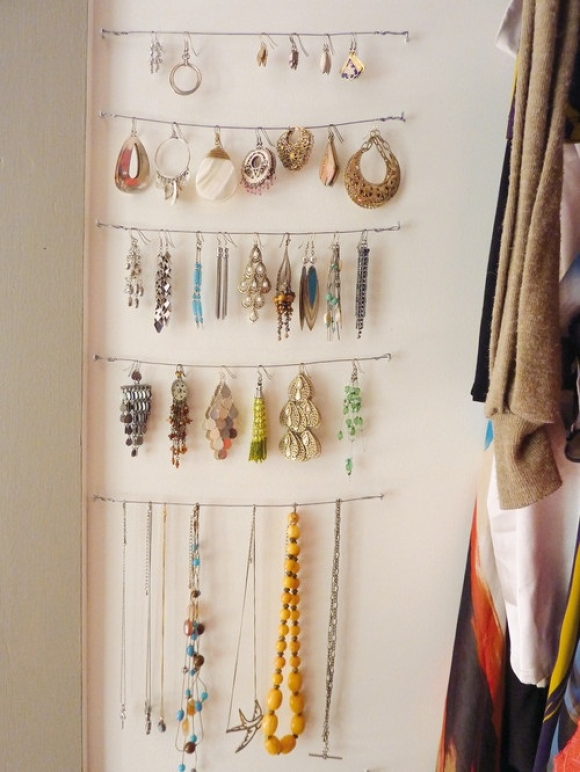 แทนที่จะเอาเครื่องประดับไปเก็บในลิ้นชักให้พันกันยุ่งเหยิง ชนิดที่ว่ากว่าจะหยิบใช้ได้แต่ละทีก็ต้องมาแกะกันให้วุ่นวาย ก็เปลี่ยนมาแขวนสร้อยเส้นสวย ๆ ของคุณไว้บนราวติดผนังแทนดีกว่า จะได้ใช้เป็นของแต่งห้องไปในตัว แล้วก็จะได้เก็บที่ในลิ้นชักไว้ใส่ของอย่างอื่นที่จำเป็นเท่านั้นด้วย ส่วนผู้ชายที่ไม่ได้สะสมเครื่องประดับ อาจเอาพวกเนคไทมาแขวนแทนดูก็ได้เหมือนกันนะ