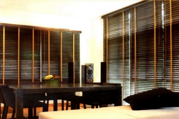 14. สมมุติว่าเป็นไม้ ม่านปรับแสงไม้ขาดแผ่นกว้าง 2 นิ้วกำลังเป็นที่นิยม ช่วยให้บ้านมีอารมณ์สบายแบบรีสอร์ท แต่ราคาค่อนข้างสูง คุณอาจเลือกใช้ม่านปรับแสงที่ทำจากอะลูมิเนียมแทน โดยเลือกขนาดของแผ่นม่านให้เท่ากัน ขึงด้วยแถบผ้าสีเข้มๆ เช่น สีดำหรือสีน้ำตาล ก็จะได้ม่านปรับแสงที่ดูดีแต่ราคาถูกกว่าเยอะ