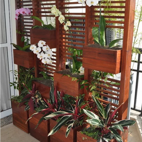 ไอเดียนี้ทั้งสวยและมีประโยชน์ด้วยเพราะเป็นการเพิ่มลูกเล่นให้กับฉากไม้ที่เป็นซี่ๆ ที่มักเอาไว้กั้นพื้นที่หรือบังตา เมื่อทำช่องไว้สำหรับปลูกต้นไม้แล้วดูเหมาะสมพอดี กลายเป็นฉากสีเขียวที่สดชื่นและเย็นสบาย