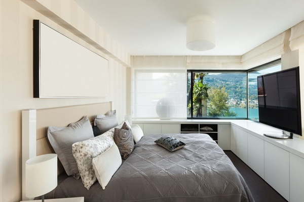 ในห้องนอนนั้น ไม่ต้องเลือกที่มีความหนามากจนเกินไปแล้ว เพราะทีวีปัจจุบันเป็นจอแบน บางรุ่นก็สามารถแขวนไว้บนผนังได้ ที่ซึ่งเหมาะสำหรับชั้นวางทีวี ก็คือผนังที่เป็นทางเดินเข้ามาในห้อง แนวเดียวกับประตูที่เปิดเข้ามา