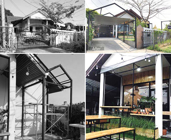 การออกแบบ : เราต้องการห้องเล็ก ๆ ไว้นั่งทำงานและไว้คุยกับลูกค้า มีที่จอดรถ 1 คัน และมีพื้นที่วางสินค้ารวมไปถึงพื้นที่สีเขียวไว้นั่งเล่นพักผ่อน