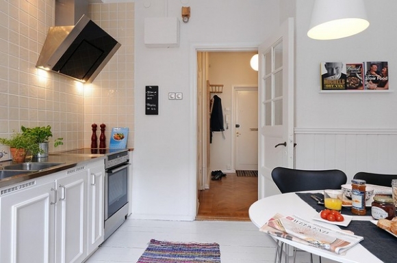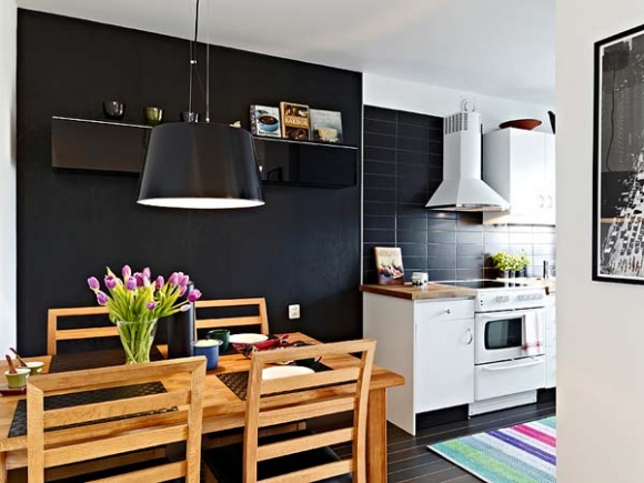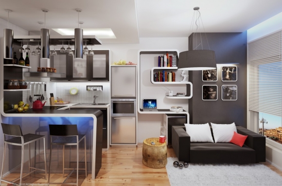 มีการแบ่งกั้นห้องนั่งเล่น ห้องครัว และส่วนประตูทางเข้าห้องแยกกันอย่างชัดเจน สำหรับเตียงนอนนั้นจะใ้ช้เป็นเตียงนอนแบบพับเก็บได้ ติดตั้ง built-in ในห้องนั่งเล่น เพื่อประหยัดเนื้อที่ ส่วนห้องครัวและโต๊ะอาหารก็จะแยกไปอีกด้านหนึ่ง เวลาประกอบอาหารจะไม่รบกวนห้องนั่งเล่นอย่างแน่นอน