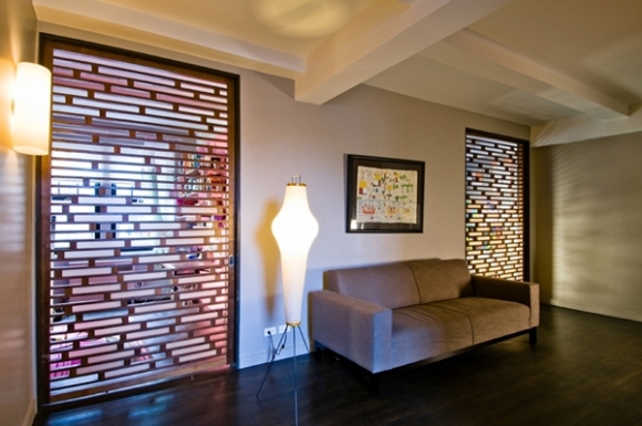 เริ่มจากเติมแต่งผนังทึบเป็นบานกระจกแบบสไลด์ ปิดทับด้วยม่านผืนบาง ช่วยลดระดับความร้อนแรงของแสงจากภายนอกได้หนึ่งขั้น ส่วนด้านในก็กั้นพื้นที่สำหรับห้องต่าง ๆ ด้วยพาทิชั่นไม้ลายฉลุ เพื่อสร้างความเป็นส่วนตัว แต่ในขณะเดียวกันก็ยังคงรักษาความโปร่งสบายของบรรยากาศภายในเอาไว้ได้ นอกจากนี้ยังใช้พื้นที่ได้อย่างคุ้มค่า ด้วยการบิวท์อินงานไม้ขึ้นมาเป็นโต๊ะ ตู้ และเฟอร์นิเจอร์อื่น ๆ จากนั้นนำไม้ส่วนที่เหลือมาทำเป็นของตกแต่งเพิ่มเติมด้วย