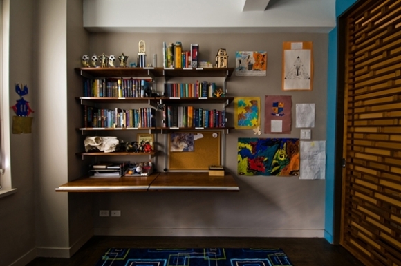 พร้อมกันนี้ยังใช้ประโยชน์ส่วนใหญ่จากพื้นที่ในแนวตั้ง ซึ่งช่วยให้เหลือพื้นที่ในแนวนอนสำหรับทำกิจกรรมอื่น ๆ ได้อีกมาก อย่างเช่น มุมทำงานเล็ก ๆ หับห้องสมุดส่วนตัว ที่มีชั้นวางหนังสือทอดตัวไปตามแนวห้อง เก็บหนังสือได้อย่างไม่จำกัด ส่วนวัสดุที่นำมาใช้ก็เป็นวัสดุรีไซเคิลแทบทั้งสิ้น ไม่ว่าจะเป็นแผ่นไม้ที่นำมาตกแต่งในส่วนของพาทิชั่น หรือเฟอร์นิเจอร์บิวท์อินในรูปแบบที่แตกต่าง