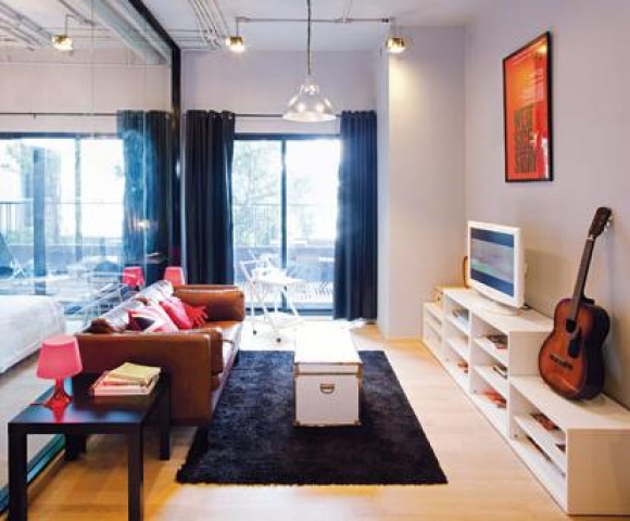 พื้นที่ในห้องได้รับการปรับโฉมใหม่ ด้วยการรื้อผนังเดิมของห้องที่เชื่อมกันระหว่างห้องนอนกับห้องรับแขกออก เพื่อให้ดูกว้างขึ้น แล้วกั้นพื้นที่ด้วยกระจกใสแทน ส่วนฝ้าเพดานก็รื้อแผ่นยิปซัมออก ปล่อยโล่งแล้วทาสีให้เพดานดูสูงขึ้นอีกเล็กน้อย ภายในประกอบด้วยมุมแพนทรี่เล็ก ๆ กับชุดโต๊ะรับประทานอาหารสามารถพับเก็บได้เพื่อประหยัดพื้นที่ ถัดไปเป็นห้องรับแขกและส่วนห้องนอนที่มีห้องน้ำในตัว