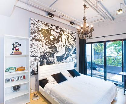 “ผมออกแบบห้องนี้สำหรับพักคนเดียว ดังนั้นจึงทำตามใจตัวเองได้เต็มที่ แตกต่างจากบ้านที่ลาดพร้าวที่จะเน้นสีขาวเป็นหลัก ห้องนี้เน้นใช้โทนสีดำ เทา ดูทึม ๆ ให้ความรู้สึกดิบ ๆ สไตล์ลอฟต์ เดินระบบสายไฟด้วยท่อเหล็กให้ได้จังหวะและองค์ประกอบที่ลงตัว ซึ่งของเดิมวางไว้ไม่สวยเราจึงรื้อแล้วเดินสายไฟใหม่ทั้งหมด
