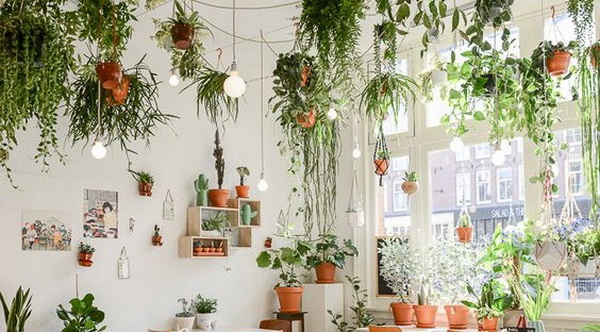 อีกหนึ่งทางเลือกของคนพื้นที่จำกัดนั่นก็คือ การจัดสวนแขวน โดยเลือกมุมใดมุมหนึ่งของภายในบ้านที่มีพื้นที่ว่างอยู่สำหรับจัดสวน เลือกพรรณไม้ที่ดูแลง่ายและเจริญเติบโตได้ดีในร่มรวมไปถึงพื้นที่ที่มีแสงแดดน้อย อาทิเช่น เฟิน หรือ พลูด่าง เป็นต้น ไอเดียนี้เลือกตะแกรงเหล็กฉีกมาเป็นที่แขวนทำให้แขวนไม้กระถางได้หลากหลาย กลายเป็นมุมลอฟท์เท่ๆ ส่วนเรื่องการดูแลนอกจากจะหมั่นฉีดสเปรย์บ่อยๆแล้ว การใช้กาบมะพร้าวมาผสมกับดินในการปลูกก็ช่วยเก็บความชุ่มชื้นให้กับต้นไม้ได้อีกด้วย