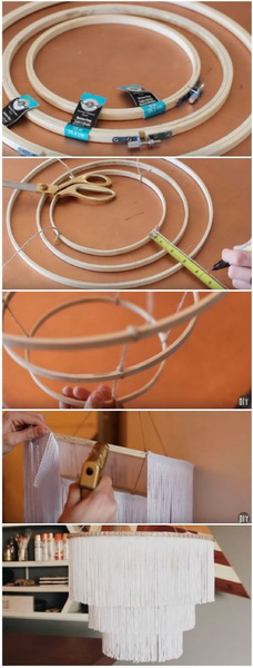 สะดึงไม้ นอกจากจะใช้สำหรับปักผ้าแล้ว ยังเอามา d.i.y แต่งห้องได้อีกด้วย ลองหาไซส์สะดึงไม้ที่ต่างกัน มาวางไว้ด้วยกัน ใช้เชือกป่านมัดสะดึงไว้ทั้งสามอัน จากนั้นใช้กาวปืนยิงเชือกหรือไหมพรมติดเรียงกันรอบๆ ตามภาพ