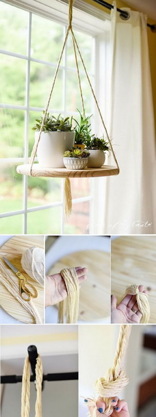 หาแผ่นไม้สวยๆ มา d.i.y แต่งห้องด้วยการใช้เชือกมัดรวมกัน แล้วแขวนไว้กับราวติดผนัง ช่วยเพิ่มพื้นที่ใช้สอยภายในห้อง สามารถโชว์ของสวยๆ งามๆ ได้ชัดขึ้น โดยเฉพาะการวางต้นไม้เล็กๆ จะทำให้ห้องดูสดชื่นและเป็นธรรมชาติมากขึ้น แต่ควรระวังถ้าวางของที่สามารถแตกได้ ไม่ควรแขวนไว้บริเวณที่ลมแรง