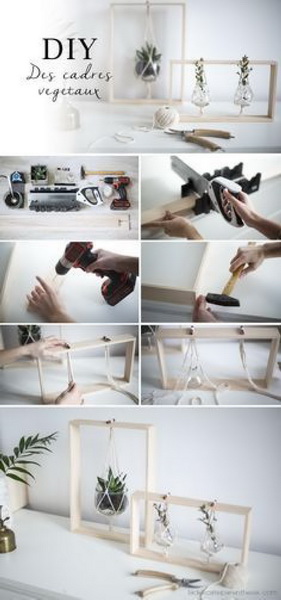ไปเดินชอปปิ้งด้วยโครงกรอบไม้ หรือกรอบรูปไม้สวยๆ ถอดแผ่นสำหรับประกบรูปออก นำเชือกผูกกระถางต้นไม้ไว้ เพื่อเอามาแขวนกับกรอบไม้ นอกจากจะเก๋แปลกตาแล้ว ยังทำให้ดูเหมือนกรอบรูปที่มีชีวิตชีวาขึ้น สามารถสัมผัสและดูแลได้ด้วยความใส่ใจกับรายละเอียดเล็กๆ ของสิ่งที่กำลังเติบโต