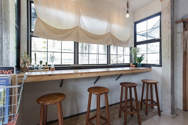 บาร์สุดชิคจากไม้เหลือใช้แผ่นยาว ถ้าใครที่มีฝีมือช่างและหัวใจศิลป์มากพออาจอยากทำเป็นเฟอร์นิเจอร์หรือของใช้ในบ้านไว้ใช้เองแบบไม่ซ้ำใคร ชวนมาทำมินิบาร์เก๋ๆริมหน้าต่าง โดยนำแผ่นไม้ความยาวตามขนาดพื้นที่ยึดให้แน่นด้วยฉากยึดมุม บนโต๊ะวางแคคตัส หรือต้นไม้ชนิดอื่นตามใจชอบ เสริมด้วยเก้าอี้ สร้างคุณค่าให้แผ่นไม้เก่ากลายเป็นโต๊ะบาร์นั่งชมสวน