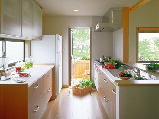 - การจัดครัวตามแนวยาวของผนังหรือสองทางมีทางเดินกลาง ซึ่งทางเดินกลางไม่ควรเป็นทางผ่านสาธารณะของบ้านเพราะจะขัดขวางการทำงาน