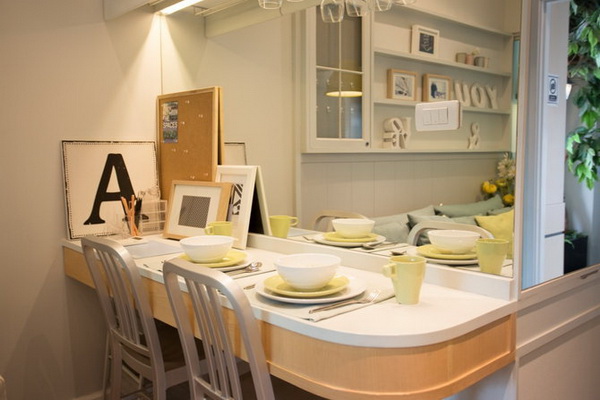 4. จัดสรรพื้นที่ให้ลงตัว นอกจากการเลือกใช้โต๊ะและเก้าอี้ที่มีขนาดกะทัดรัดแล้ว การทำโต๊ะแบบบิลท์อินติดขนานไปกับผนังของห้องเลยก็ช่วยในการประหยัดพื้นที่ใช้สอยได้เป็นอย่างดี แถมยังสามารถเปลี่ยนจากแบบห้องอาหารเป็นพื้นที่ของห้องทำงานได้อีกด้วย