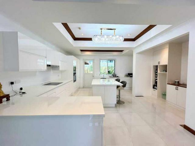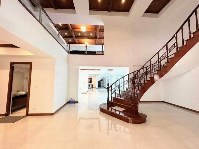 The villa features a large swimming pool with sala and terrace, perfect for relaxing outdoors. Inside, you will find a beautiful living room with high ceiling, a large elegant kitchen, and a grand entrance with an impressive staircase. There are 5 spacious bedrooms with en suite bathrooms 3 bedrooms on the main floor, 1 bedroom upstairs, and a large master suite with walk-in closet and big bathroom.