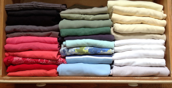 หากคุณเก็บเสื้อชั้นใน กางเกงชั้นใน ถุงเท้าซ้อนทับไว้ด้วยกัน ซึ่งมาริเอะ คนโดะแนะนำว่าให้เก็บสิ่งเหล่านี้ไว้ข้างๆ กัน และจัดเรียงในลักษณะเหมือนวางหนังสือ การจัดแบบนี้จะช่วยให้คุณมองเห็นสิ่งต่างๆ ได้ชัดเจนและทันที ซึ่งส่วนหนึ่งช่วยให้คุณรู้ว่าคุณมีเสื้อผ้าเหล่านี้แล้วและป้องกันการซื้อซ้ำ