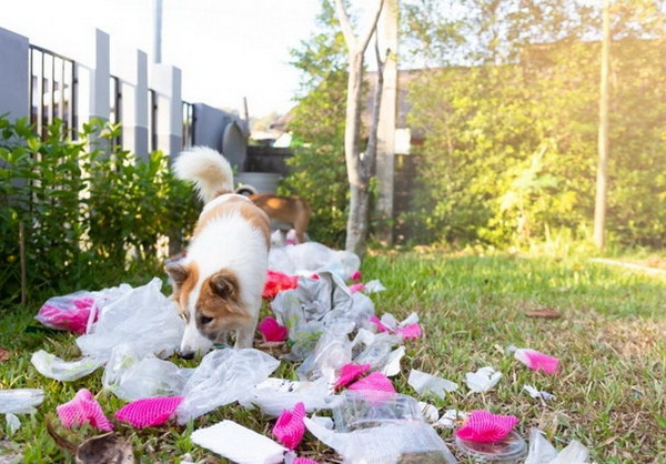 เมื่อมีถุงขยะวางทิ้งไว้ สุนัขจรจัดอาจย่องมากัดถุงจนขาด แล้วคุ้ยหาเศษอาหารจนขยะกระจายเต็มหน้าบ้าน หรือแม้จะใส่ถังขยะแล้ว สุนัขก็ยังฉลาดพอที่จะล้มถังลงได้ การแก้ปัญหาถังขยะหน้าบ้านจึงต้องคำนึงถึงเรื่องนี้ด้วย โดยเจ้าของบ้านอาจเลือกใช้ถังขยะใบใหญ่ที่ล้มยาก ใช้ถังขยะขนาดใหญ่แบบมีฝาปิด หรือใช้ถังขยะที่มีขาตั้งกันล้ม หรือเก็บถังขยะไว้ในรั้วบ้านจนกว่ารถเก็บขยะจะมาก็ได้