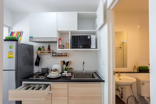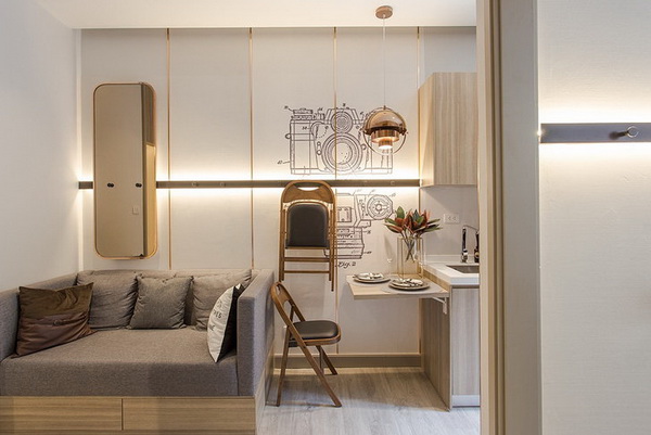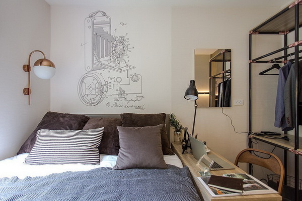 ยิ่งคอนโดมีขนาดเล็ก ยิ่งต้องเลือกเฟอร์นิเจอร์ชิ้นเดียวให้ใช้งานได้หลากหลายเพื่อประหยัดพื้นที่ เน้นเฟอร์นิเจอร์ลอยตัว เพราะสามารถปรับเปลี่ยนขยับขยายได้ง่าย รองรับการใช้งานในอนาคตได้ตามต้องการ แทนการบิลท์อิน เหมือนกับไอเดียนี้เลือกโต๊ะไม้ดีไซน์เรียบง่าย สำหรับนั่งทำงาน ทั้งยังเป็นโต๊ะเครื่องแป้งไปในตัวได้อีกด้วย