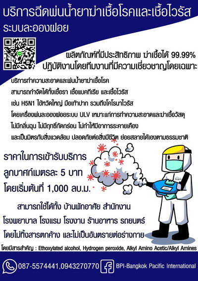 บริการพ่นน้ำยาฆ่าเชื้อโรคและเชื้อไวรัส โดยผลิตภัณฑ์ที่สามารถฆ่าเชื้อได้ 99.99% ปฏิบัติหน้าที่โดยทีมงานที่มีความเชียวชาญโดยการพ่นน้ำยาพ่นระบบละอองฝอย ULV ที่มีละอองฝอยเล็กถึง 30 ไมครอนการพ่นน้ำยาฆ่าเชื้อนั้นสามารถกำจัดได้ทั้ง เชื้อโรค เชื้อแบคทีเรีย เชื้อรา และเชื้อไวรัส ได้ถึง 99.99% (H1N1 H5N1 SARS มือเท้าปาก CORONA VIRUS)ยังลดกลิ่นไม่พึงประสงค์ และทำลายคราบไขมันที่ฝั่งลึก น้ำยาไม่ส่งผลกระทบต่อร่างกายและเป็นมิตรกับสิ่งแวดล้อม สามารถย่อยสลายได้เองตามธรรมชาติ