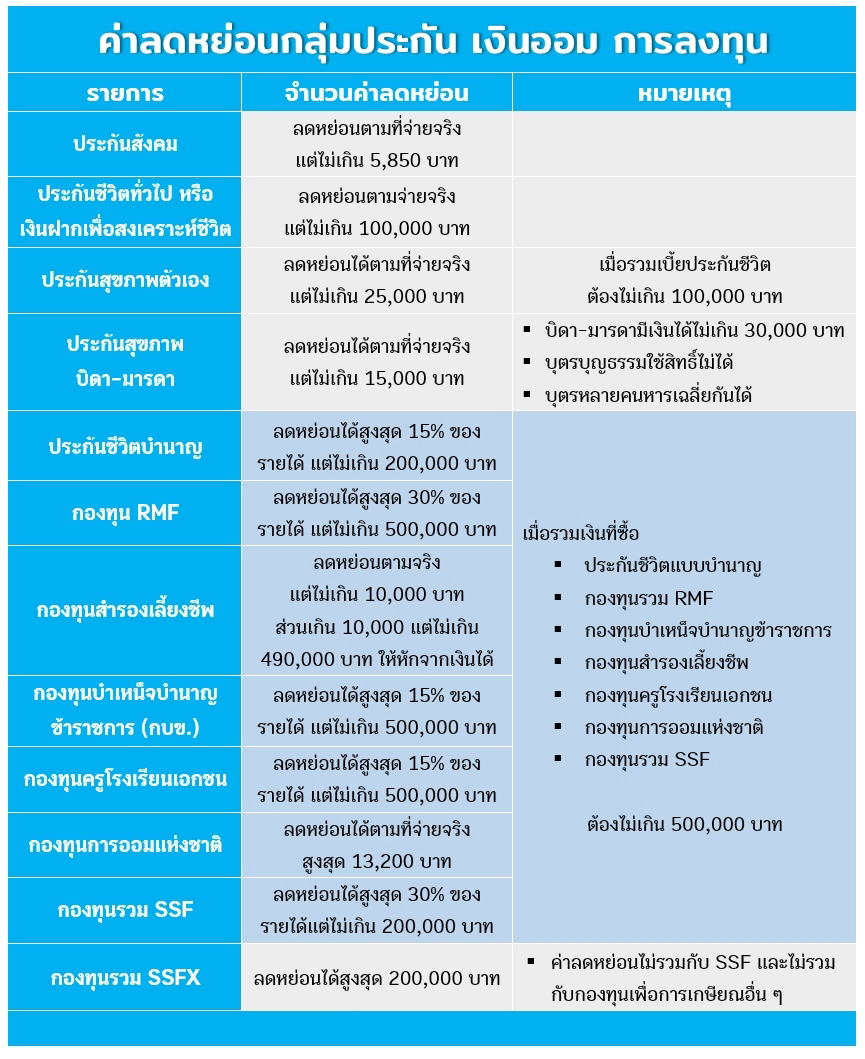 คลิกดูภาพใหญ่ สรุปค่าลดหย่อนกลุ่มประกัน เงินออม การลงทุน