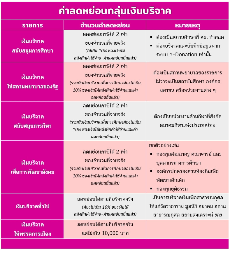 แบ่งเป็นกลุ่มเงินบริจาคที่ลดหย่อนภาษีได้ 2 เท่า และกลุ่มเงินบริจาคที่ลดหย่อนภาษีได้ตามที่จ่ายจริง