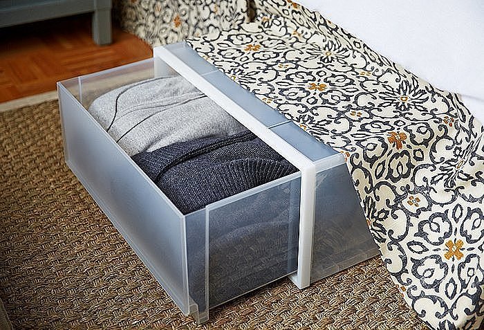 เชื่อสิว่าของที่วางอยู่ในห้องคุณนั้น มีหลายชิ้นทีเดียวที่เป็นของไม่ที่ไม่จำเป็นต้องหยิบมาวางก็ได้ เช่น เสื้อกันหนาวที่ไว้ใส่ปีละไม่กี่หน หรือของตกแต่งชิ้นใหญ่ที่ได้รับมาเป็นของขวัญวันเกิด บอกได้เลยว่าของเหล่านี้แหละเป็นตัวการชั้นดีที่ทำให้ห้องของคุณดูเล็ก และแคบลงไปกว่าเดิม ฉะนั้นหากล่องสี่เหลี่ยมมาเก็บของที่ไม่ค่อยได้ใช้ประโยชน์เหล่านี้ แล้วนำกล่องที่เก็บของไปวางไว้บนตู้เสื้อผ้า หรือใต้เตียงให้พ้นสายตา และไม่ใช้เนื้อที่บนพื้นห้องดีกว่า เพียงเท่านี้ห้องของคุณจะดูโล่งสะอาด และมีที่ไว้ให้วางของอย่างอื่นอีกเยอะเลย