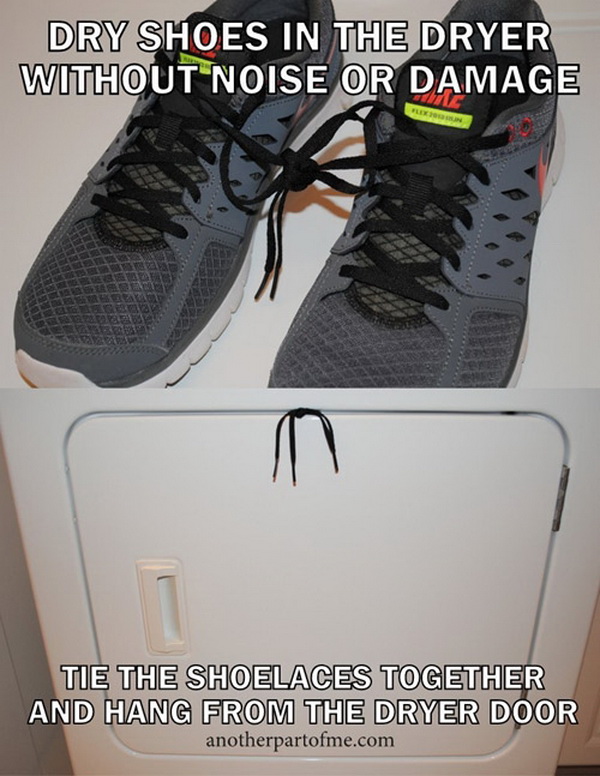 อยากให้รองเท้าแห้งไวทันหยิบใช้งาน แต่ก็กลัวว่าถ้านำไปปั่นในเครื่องปั่นแห้งแล้วจะทำให้เกิดเสียงดังหรืออาจส่งผลทำให้เครื่องพังเอาได้ ก็แค่ผูกปลายเชือกรองเท้าเอาไว้แล้วนำไปขัดกับฝาเครื่อง เพื่อยึดรองเท้าไม่ให้โดนเหวี่ยงไป-มาตอนเครื่องซักผ้ากำลังทำงาน