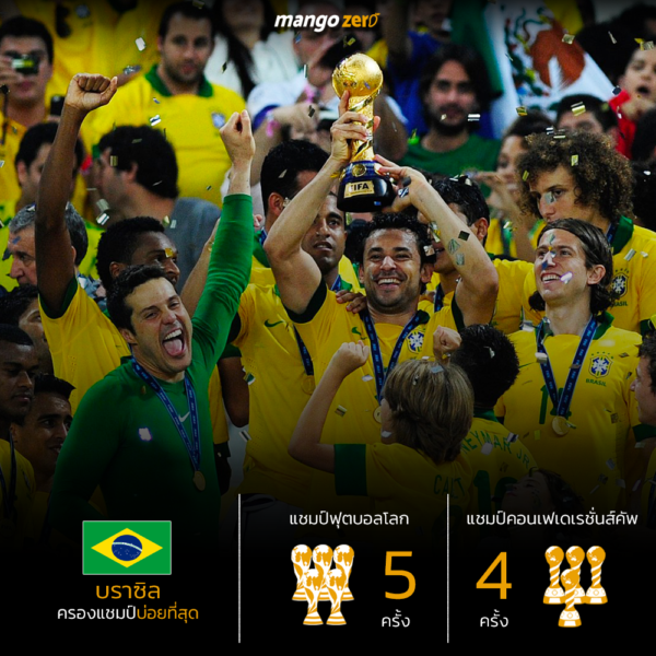 Brazil ¶×ͤÃͧʶԵԷÕÁ·ÕèÁըӹǹ¤ÃÑé§·Õ誹ÐàÅÔȿصºÍÅâÅ¡ÁÒ¡·ÕèÊØ´ ·Ñé§ËÁ´ 5 ¤ÃÑé§ (ã¹»Õ 1958, 1962, 1970, 1994, 2002) áÅÐÂѧÁըӹǹ¤ÃÑé§·Õ誹ÐàÅÔÈ FIFA Confederations Cup ÁÒ¡·ÕèÊØ´ÍÕ¡´éÇ (4 ¤ÃÑé§ ã¹»Õ 1997, 2005, 2009, 2013)