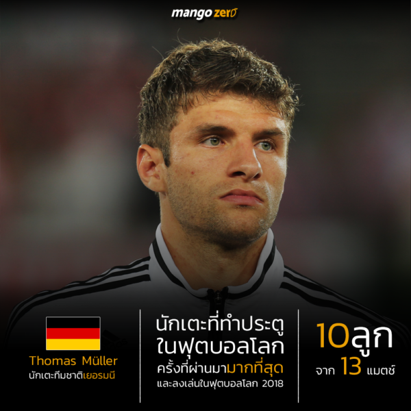Thomas Müller ¤×͹ѡàµÐ·Õè·Ó»ÃеÙä´éÁÒ¡·ÕèÊØ´ã¹Ãͺ 32 ·ÕÁÊØ´·éÒÂ㹿صºÍÅâÅ¡ã¹Êͧ¤ÃÑé§ÅèÒÊØ´·Õè¼èÒ¹ÁÒ(ã¹»Õ 2010 áÅÐ 2014) áÅлչÕé¡çÂѧ¤§·Ó˹éÒ·Õèà»ç¹¹Ñ¡àµÐ·ÕÁªÒµÔ¢Í§àÂÍÃÁ¹Õà¾×èÍŧáªè§¢Ñ¹ã¹¿ØµºÍÅâÅ¡»Õ 2018 à¤Â·Ó»ÃеÙä»ä´é 10ÅÙ¡ ¨Ò¡¡ÒÃá¢è§·Ñé§ËÁ´ 13 áÁ·ªì
