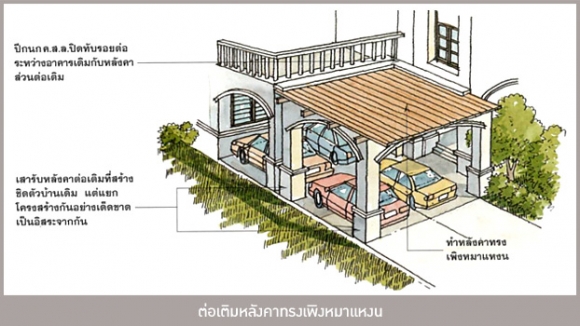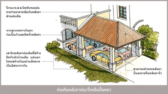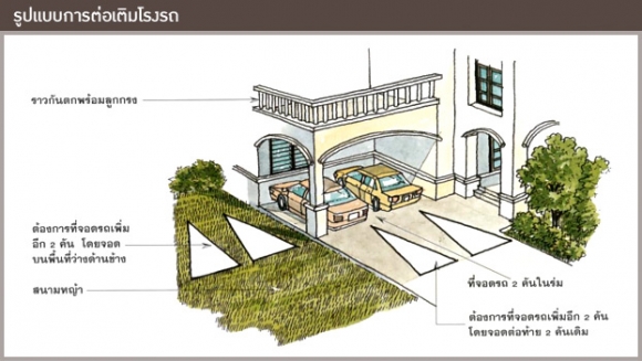 ปัจจุบันคนเรามีรถยนต์ส่วนตัวกันมากขึ้นทำให้พื้นที่จอดรถในบ้านพักอาศัยไม่เพียงพอ หลายคนใช้วิธีการจอดทับสนามหญ้าหน้าบ้าน นานเข้าหญ้าก็ตาย กลายเป็นลานดินสำหรับจอดรถไปโดยปริยาย ดังนั้นคนจึงหันมาต่อเติมโรงรถ เพื่อให้รถมีที่จอดเป็นที่เป็นทางและมีหลังคากันแดดกันฝนกันมากขึ้น ในการต่อเติมโรงรถนั้นต้องพิจารณาถึง 2 ปัจจัย คือ ขนาดพื้นที่จอดรถ รูปแบบการต่อเติม