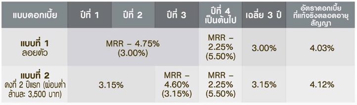 - แบบที่ 2 สำหรับผู้กู้รายได้ตั้งแต่ 20,000 บาทต่อเดือนขึ้นไป อัตราดอกเบี้ยเริ่มต้น 3.00% ต่อปี