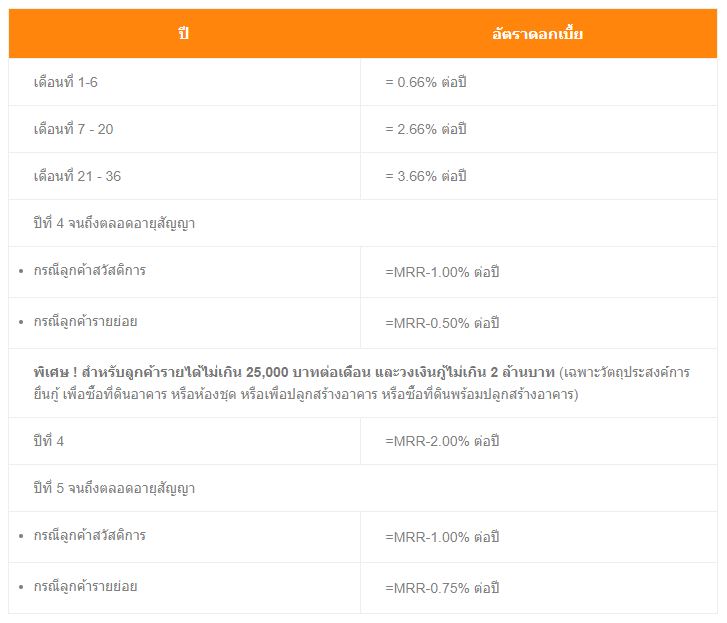 จะกู้บ้านทั้งที ถ้าได้ดอกเบี้ยต่ำหน่อยก็คงช่วยแบ่งเบาภาระไปได้เยอะ ซึ่ง "สินเชื่อวิมานเมฆ" น่าสนใจตรงที่คิดดอกเบี้ยเฉลี่ย 3 ปีแรกเพียง 2.77% ต่อปี โดย 6 เดือนแรกคิดดอกเบี้ยเพียง 0.66% ต่อปีเท่านั้นเอง และหากวงเงินกู้ไม่เกิน 2 ล้านบาท ปีที่ 4 ยังจะได้ดอกเบี้ย MRR-2.00% ตามตารางนี้