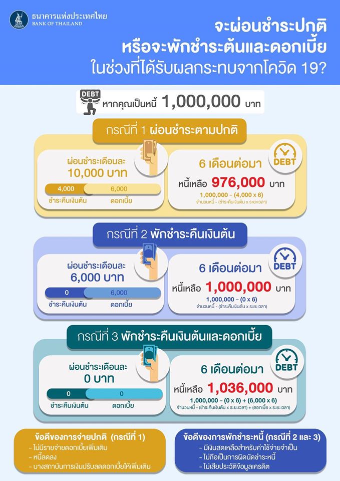 ถ้าท่านอยู่ในกลุ่มที่ยังพอมีศักยภาพ อาจเลือกชำระตามปกติเพราะจะช่วยให้ไม่ต้องจ่ายดอกเบี้ยเพิ่มเติม หนี้ไม่เพิ่ม และบางธนาคารให้สิทธิพิเศษปรับลดดอกเบี้ยเพิ่มเติม แต่สำหรับท่านที่ได้รับผลกระทบ มีสภาพคล่องไม่พอ แนวทางการเลื่อนหรือพักชำระหนี้ก็จะเป็นทางออกหนึ่งสำหรับช่วงนี้