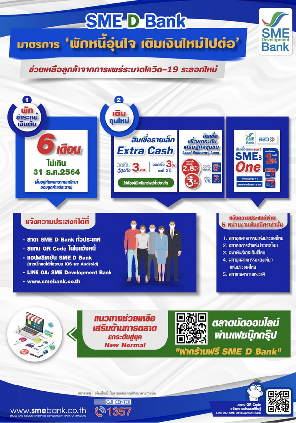 ธนาคารพัฒนาวิสาหกิจขนาดกลางและขนาดย่อมแห่งประเทศไทย หรือ "SME D BANK" ออกมาตรการ "พักหนี้อุ่นใจ เติมเงินใหม่ ไปต่อ" เพื่อช่วยเหลือลูกค้าจากการแพร่ระบาดของโควิด-19 ระลอกใหม่ โดยแบ่งออกเป็น 2 ส่วนหลัก ได้แก่ โครงการพักชำระหนี้เงินต้น และ โครงการเติมทุนใหม่ ผ่านการปล่อยสินเชื่อในอัตราพิเศษต่างๆ ตามเงื่อนไขดังต่อไปนี้