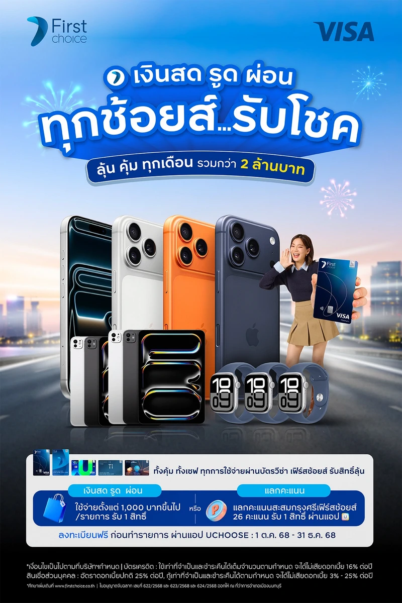 บริษัท อยุธยา แคปปิตอล เซอร์วิสเซส จำกัด ในฐานะตัวแทนแบรนด์กรุงศรีเฟิร์สช้อยส์ ชวนสมาชิกบัตรฯ ลุ้นรางวัลใหญ่ส่งท้ายปี รวมมูลค่ากว่า 2 ล้านบาท รับสิทธิ์ลุ้นรางวัลได้ทุกเดือน เพียงใช้บริการกดเงินสด, รูดช้อปทั้งหน้าร้านหรือช้อปออนไลน์ หรือผ่อนชำระสินค้าและบริการ ตั้งแต่ 1 ตุลาคม 2568 ถึง 31 ธันวาคม 2568