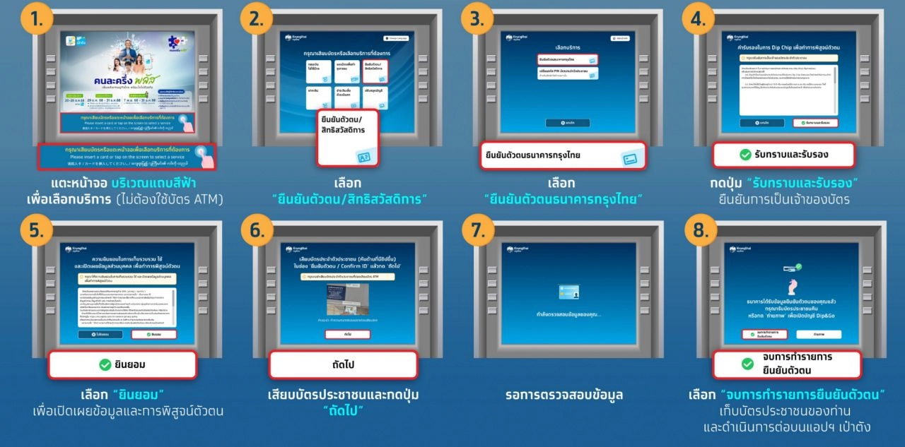 ยืนยันตัวตนผ่านตู้ ATM ธนาคารกรุงไทย (ATM สีเทา) หน้าจอแบบไม่มีปุ่มด้านล่าง