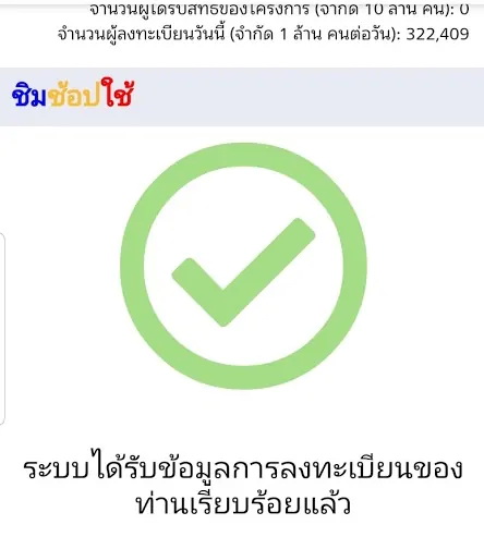 เมื่อลงทะเบียนชิมช้อปใช้เสร็จสมบูรณ์แล้ว จะขึ้นหน้าจอนี้ รอผลการลงทะเบียนชิมช้อปใช้ ภายใน 3 วัน