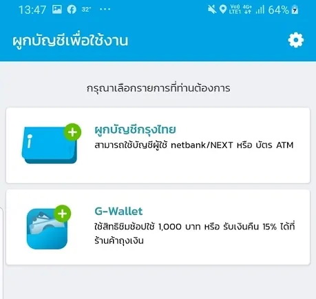 1. ดาวน์โหลดแอป เป๋าตัง ผ่านทาง App Store หรือ Play Store แล้วเปิดแอปเป๋าตัง แล้วเลือกที่ G-Wallet เพื่อลงทะเบียนรับสิทธิชิมช้อปใช้ 1,000 บาท หรือ รับเงินคืน 15%