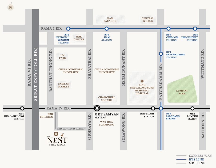 โครงการ The Nest จุฬา-สามย่าน ตั้งอยู่ระหว่างถนนพระราม 4 กับถนนสี่พระยา การเดินทางสะดวกสบาย ด้วยทำเลที่ใกล้กับสถานี MRT สามย่าน และใกล้ย่าน CBD สำคัญอย่างย่านสีลม และสยาม