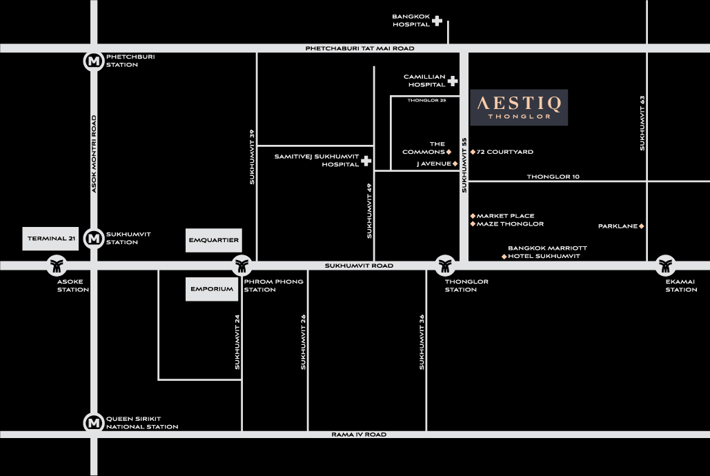 คอนโดมิเนียม Ultimate Luxury Condo สุดหรูใจกลางทองหล่อ ภายในซอยสุขุมวิท 55 พร้อมลิฟท์ส่วนตัวทุกยูนิต ให้ความเป็นส่วนตัว ผสมผสานความหรูหรา สะดวกสบาย และสงบ หนึ่งเดียวบนทำเลทองหล่อ ที่สะท้อนสุนทรียภาพความเป็นตัวคุณ พื้นที่ใกล้เคียงโครงการ AESTIQ Thonglor เป็นศูนย์รวมของ ร้านค้า Boutique Stores บาร์ชั้นนํา รวมถึงคาเฟ่และร้านอาหารสุดชิคมากมาย ที่พร้อมจะให้คุณใช้ชีวิต ได้อย่างเต็มที่ตั้งแต่เช้าจรดคํ่า เช่น J Avanue, Tops market Thonglor, Big C Ekamai, Major Ekamai, Emporium, Gateway Ekamai, EmQuatier, Terminal 21