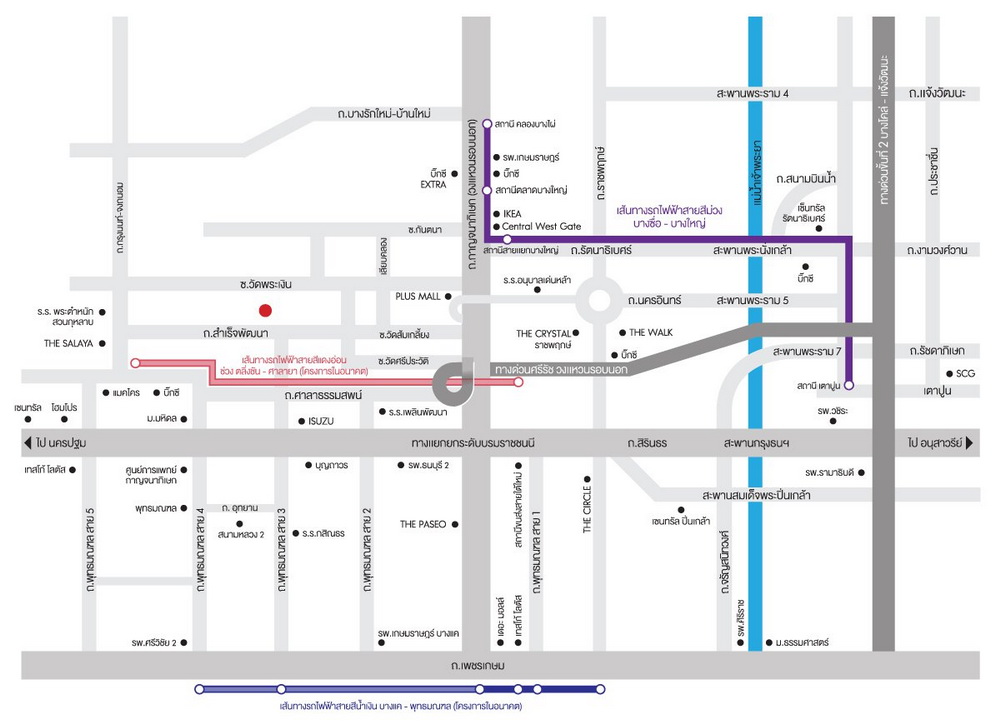 - รถไฟฟ้าสายสีม่วง สถานีตลาดบางใหญ่ : 14.2 กม.