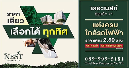พบกับคอนโดมิเนียม แต่งครบ ราคาเดียว เลือกได้ทุกทิศ กับ "เดอะ เนสท์ สุขุมวิท 71" คอนโด Low-Rise บรรยากาศดี ใกล้ชิดธรรมชาติ ที่มีพื้นที่ส่วนกลางใหญ่ที่สุดในย่านสุขุมวิท 71 ทำเลลใกล้รถไฟฟ้า BTS พระโขนง เพียง 5 นาที พร้อมรับโปรโมชั่นพิเศษ ฟรี! ทองคำ และค่าใช้จ่ายวันโอน ราคาเดียว 2.59 ล้านบาท*
