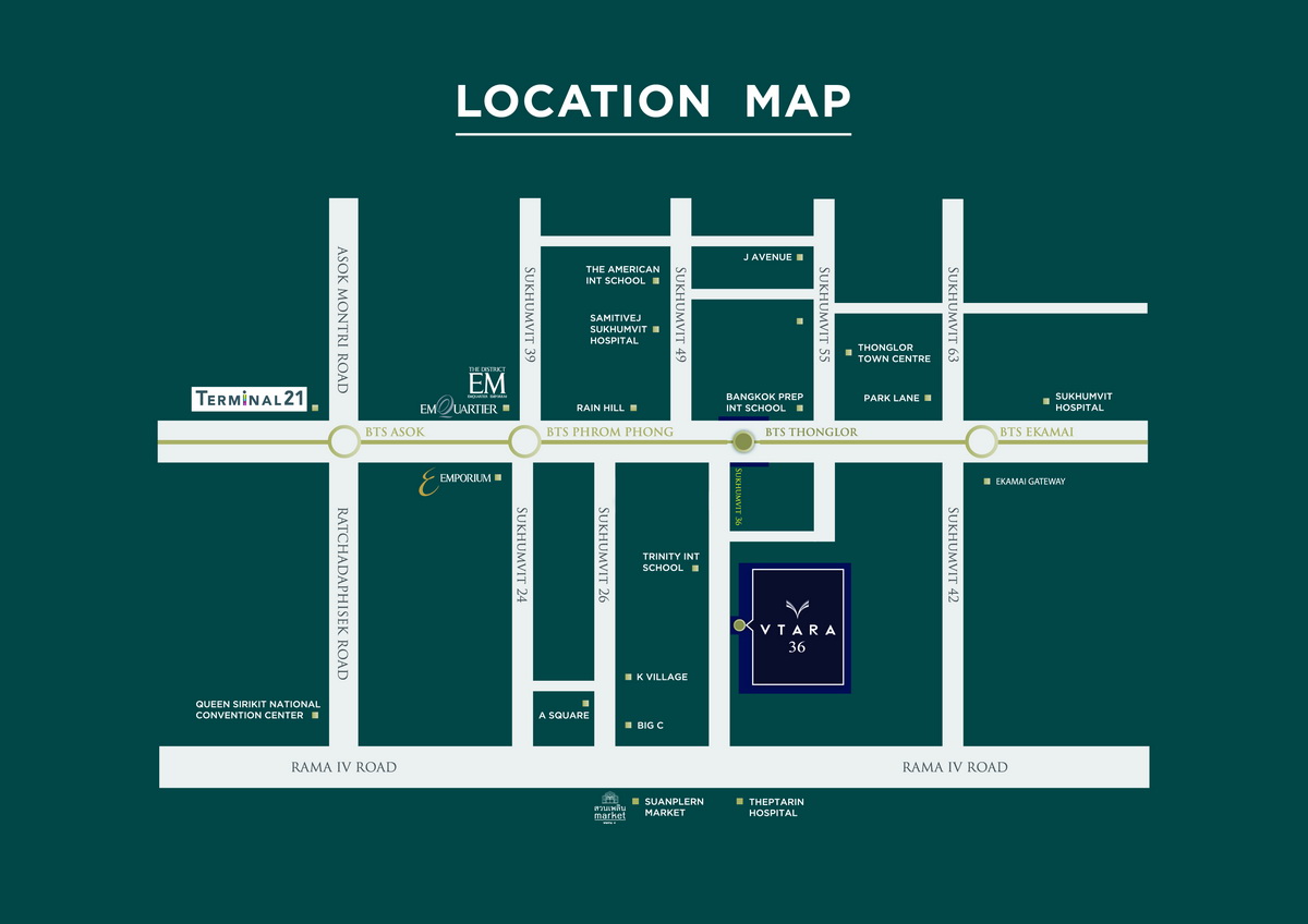 ด้วยทำเลที่ตั้งใจกลางสุขุมวิท ทำให้ VTARA แวดล้อมไปด้วยร้านอาหาร ใกล้ THE EM DISTRICT โรงเรียนและโรงพยาบาลชั้นนำ เดินทางสะดวกด้วยสถานี BTS ทองหล่อ และทางด่วนอาจณรงค์ เชื่อมต่อถนนพระราม 9 ให้คุณประหยัดเวลาในการเดินทางได้มากขึ้น