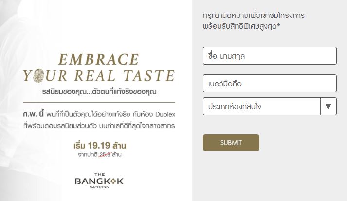 พบที่ที่เป็นคุณได้อย่างแท้จริง ที่ "The Bangkok Sathorn" คอนโดมิเนียมหรู บนทำเลที่ดีที่สุดใจกลางสาทร กับ ห้อง Duplex ที่พร้อมตอบรสนิยมส่วนตัว ทำเลติดรถไฟฟ้า BTS สถานีสุรศักดิ์ และทางด่วน กุมภาพันธ์ 2563 นี้ ห้อง Duplex ราคาพิเศษ เริ่ม 19.19 ล้านบาท* ปกติ 25.9 ล้าน เพียง 3 ยูนิตเท่านั้น