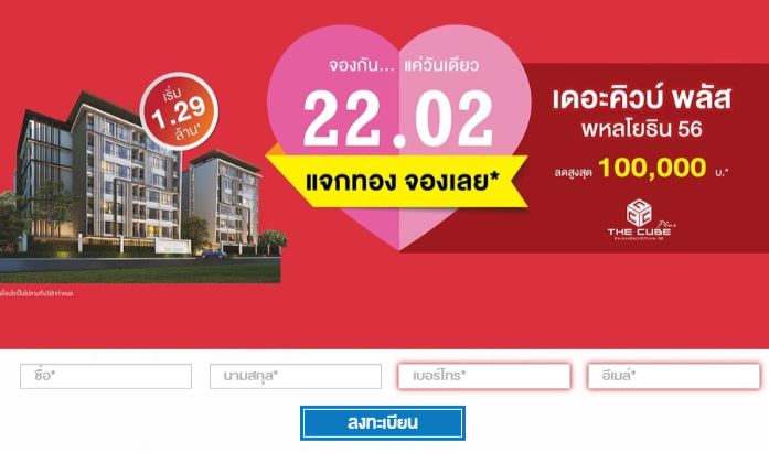พร้อมเปิดวาร์ปจัดกิจกรรมในวันพิเศษ จองกัน...แค่วันเดียว "เดอะคิวบ์ พลัส พหลโยธิน 56" คอนโดมิเนียมสไตล์โมเดิร์นโลว์ไรส์สูง 7 ชั้น รวม 2 อาคาร ใกล้รถไฟฟ้าสายสีเขียว สถานีแยก คปอ. พร้อมความเป็นส่วนตัวสูง และสิ่งอำนวยความสะดวกครบครัน พร้อมรับโปรโมชั่นพิเศษ ดาวน์ 0 บาท* รับส่วนลดสูงสุด 100,000 บาท* เมื่อจองโครงการภายในงานรับทองคำทันที* พร้อมเฟอร์นิเจอร์ครบทุกฟังก์ชั่น (Fully Furnished) จากแบรนด์ Modernform จองกัน 22 กุมภาพันธ์ 2563 นี้ แค่วันเดียว ราคาเริ่ม 1.29 ล้านบาท*