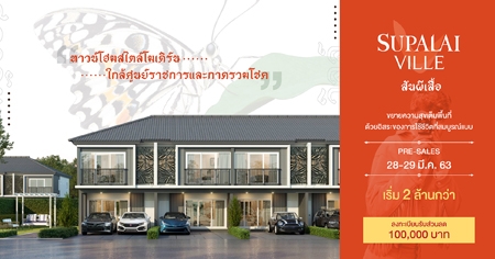 Pre-Sales ทาวน์โฮมใหม่สไตล์โมเดิร์น ใกล้ศูนย์ราชการ รับส่วนลด 100,000 บาท ศุภาลัย วิลล์ สันผีเสื้อ ทาวน์โฮมสไตล์โมเดิร์น หน้ากว้าง 5 เมตร เติมเต็มชีวิตคุณและครอบครัวให้ลงตัว ด้วยฟังก์ชั่นพิเศษที่เน้นความเรียบง่าย ช่วยเพิ่มพื้นที่ใช้สอย และช่วยให้คุณประหยัดพลังงานยิ่งขึ้น สะดวกสบายทุกการเดินทาง เชื่อมต่อศูนย์กลางธุรกิจและสถานที่สำคัญต่างๆ ใกล้ศูนย์ราชการและกาดรวมโชค เข้า-ออกเมืองเชียงใหม่ ใช้เวลาเพียงไม่กี่นาที ขยายความสุขเต็มพื้นที่...ด้วยอิสระของการใช้ชีวิตที่สมบูรณ์แบบ โปรโมชั่นพิเศษลงทะเบียนรับส่วนลด 100,000 บาท*Pre*Sales 28 - 29 มีนาคม 2563 นี้*ราคาเริ่ม 2 ล้านกว่าบาท*