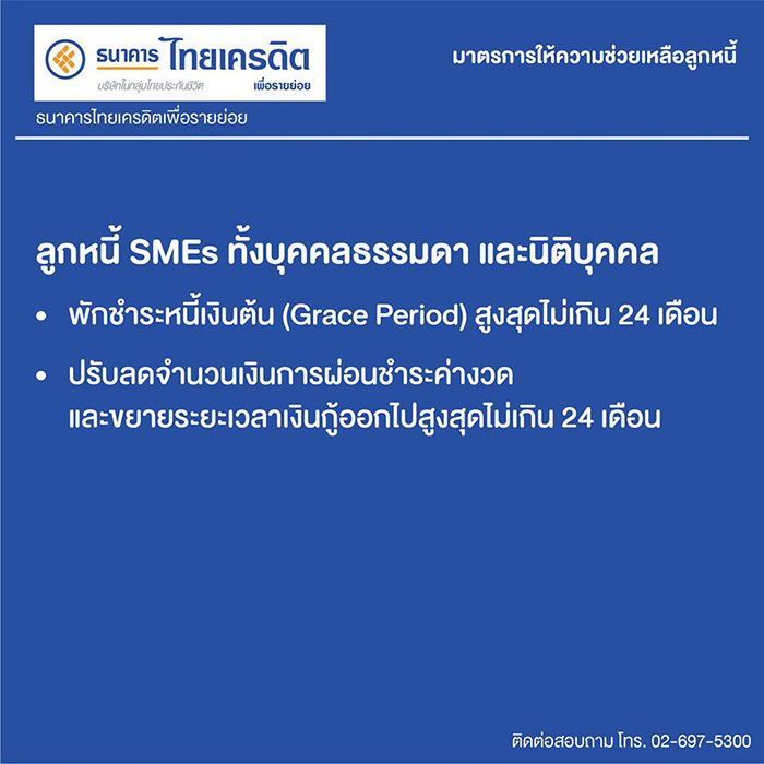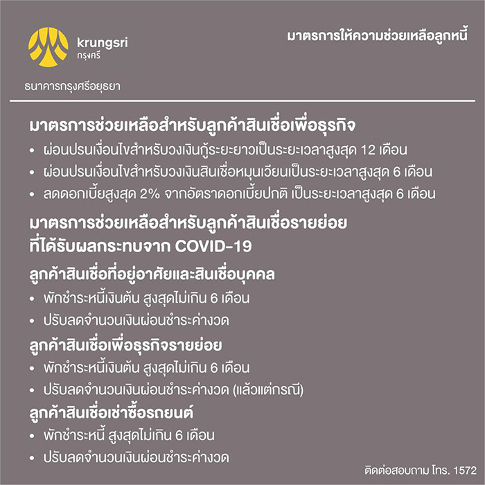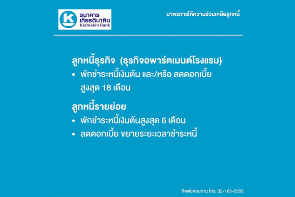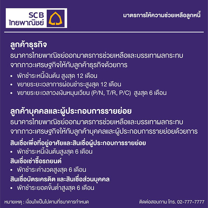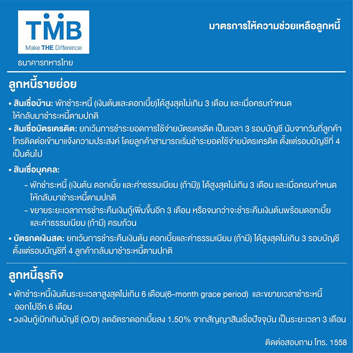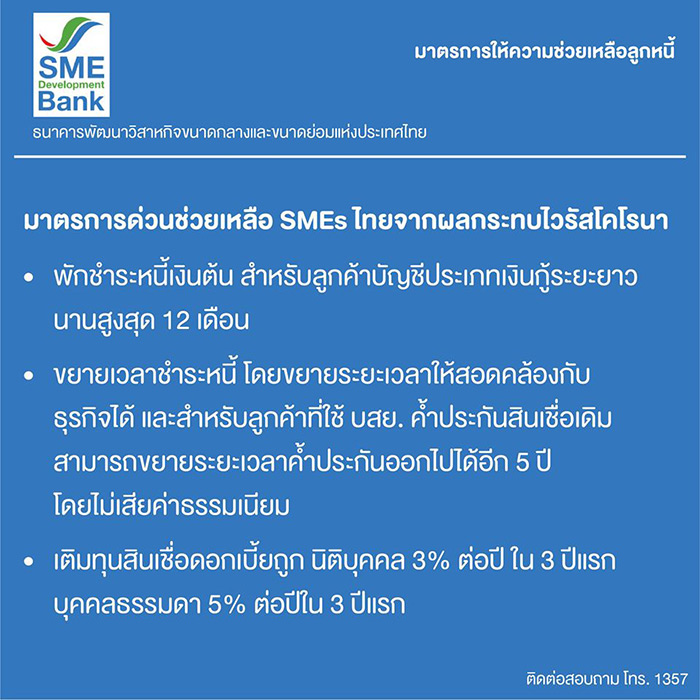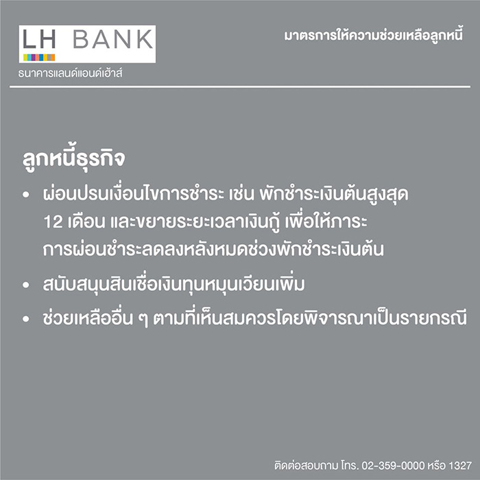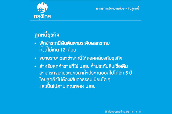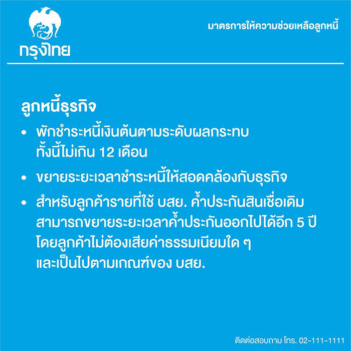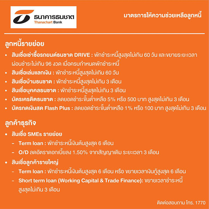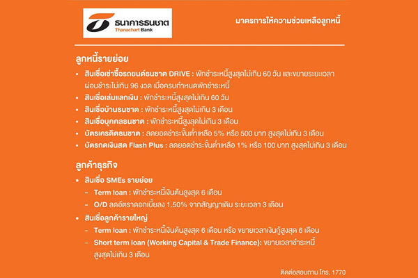 ธนาคารแห่งประเทศไทย เปิดเผยว่า แบงก์ชาติได้ติดตามสถานการณ์ต่าง ๆ รวมทั้งการแพร่ระบาดของโรคโควิด-19 ที่มีแนวโน้มลุกลามและส่งผลกระทบรุนแรงในวงกว้างต่อธุรกิจ รวมถึงประชาชนทั่วไป จึงได้ร่วมกับสถาบันการเงิน กำหนดมาตรการช่วยเหลือเพิ่มเติมแก่ลูกหนี้ธุรกิจทุกประเภทและครัวเรือนที่ได้รับผลกระทบจากเหตุการณ์ดังกล่าว