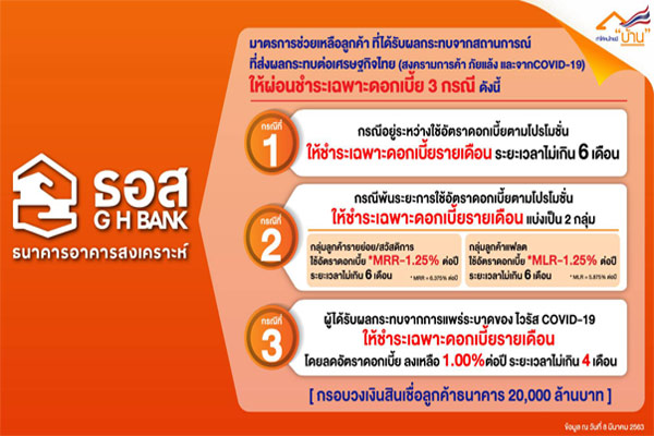 นายฉัตรชัย ศิริไล กรรมการผู้จัดการ ธนาคารอาคารสงเคราะห์ (ธอส.) เปิดเผยว่า ตามที่รัฐบาลได้ให้ความสำคัญต่อการกระตุ้นเศรษฐกิจ พร้อมไปกับการให้ความช่วยเหลือประชาชนที่อาจได้รับผลกระทบด้านรายได้จากปัญหาต่างๆ ที่ส่งผลกระทบต่อการขยายตัวของเศรษฐกิจไทย ธอส. ในฐานะสถาบันการเงินเฉพาะกิจของรัฐที่มีพันธกิจ “ทำให้คนไทยมีบ้าน” ที่ให้ความสำคัญต่อการทำให้ลูกค้าประชาชนสามารถผ่อนชำระสินเชื่อบ้านกับธนาคารได้จนถึงวันที่ครบตามวงเงินในสัญญาเงินกู้ เพื่อให้ลูกค้าได้มีบ้านเป็นของตนเองอย่างสมบูรณ์ จึงได้จัดทำมาตรการช่วยเหลือลูกค้าที่ได้รับผลกระทบจากสถานการณ์ที่ส่งผลกระทบต่อเศรษฐกิจไทย กรอบวงเงินสินเชื่อลูกค้าธนาคาร 20,000 ล้านบาท เพื่อให้ลูกค้ามีเงินทุนและสภาพคล่องเพียงพอในการดำเนินชีวิตประจำวันหรือดำเนินธุรกิจต่อไป และช่วยให้ฐานะการเงินของลูกค้าปรับตัวดีขึ้น จนมีความสามารถในการผ่อนชำระได้ต่อไป