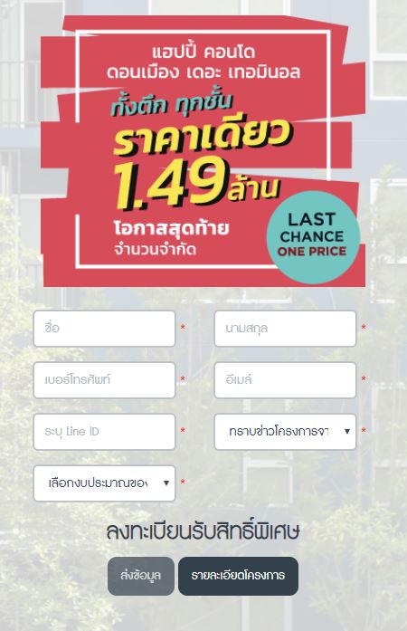 Inifinite Real Estate เตรียมจัดโปรโมชั่นพิเศษกับ "แฮปปี้ คอนโด ดอนเมือง เดอะ เทอมินอล" คอนโดบนถนนสรงประภา ใกล้สนามบินดอนเมือง ทางด่วน และรถไฟฟ้าสายอนาคต สายสีแดงเข้ม จัดโปรโมชั่นพิเศษ LAST CHANCE ONE PRICE!! ทั้งตึก ทุกชั้น ราคาเดียว จำนวนจำกัด ราคา 1.49 ล้านบาท*